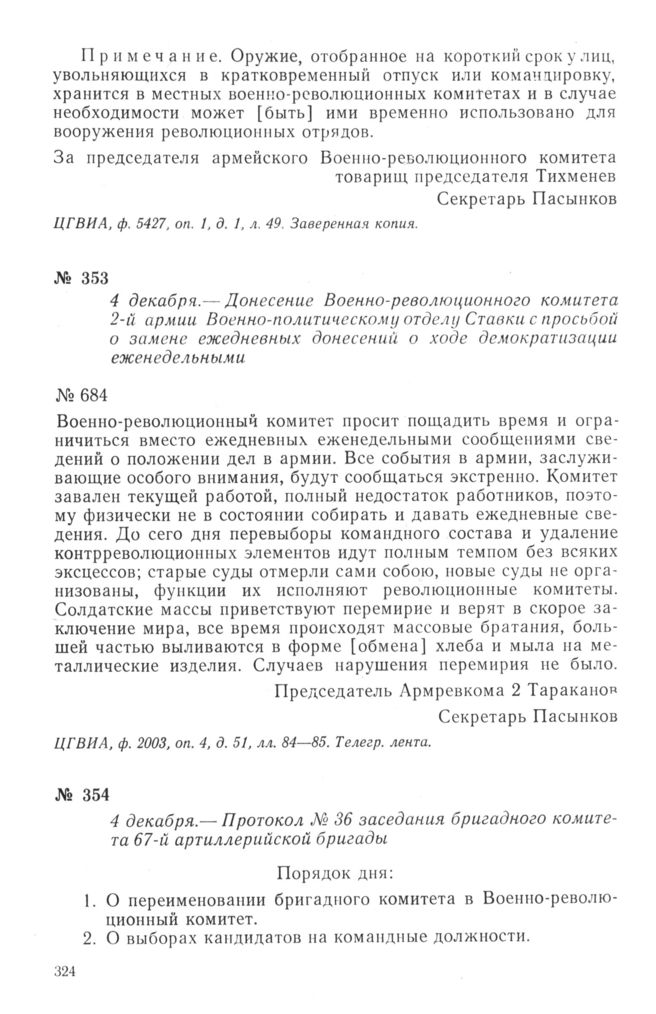 Донесение Военно-революционного комитета 2-й армии Военно-политическому отделу Ставки с просьбой о замене ежедневных донесений о ходе демократизации еженедельными. 4 декабря 1917 г. // ЦГВИА, ф. 2003, оп. 4, д. 51, лл. 84—85. Телегр. лента.