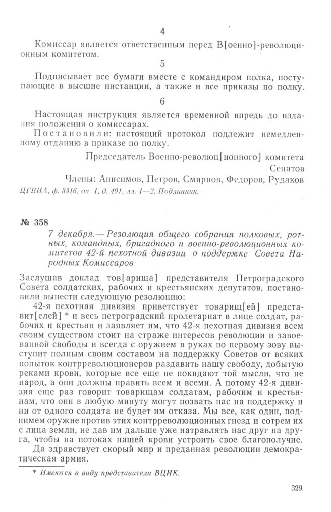 Резолюция общего собрания полковых, ротных, командных, бригадного и военно-революционных комитетов 42-й пехотной дивизии о поддержке Совета Народных Комиссаров. 7 декабря 1917 г. // ЦГАОР СССР, ф. 1235, оп. 77, д. 2, л. 66. Подлинник.