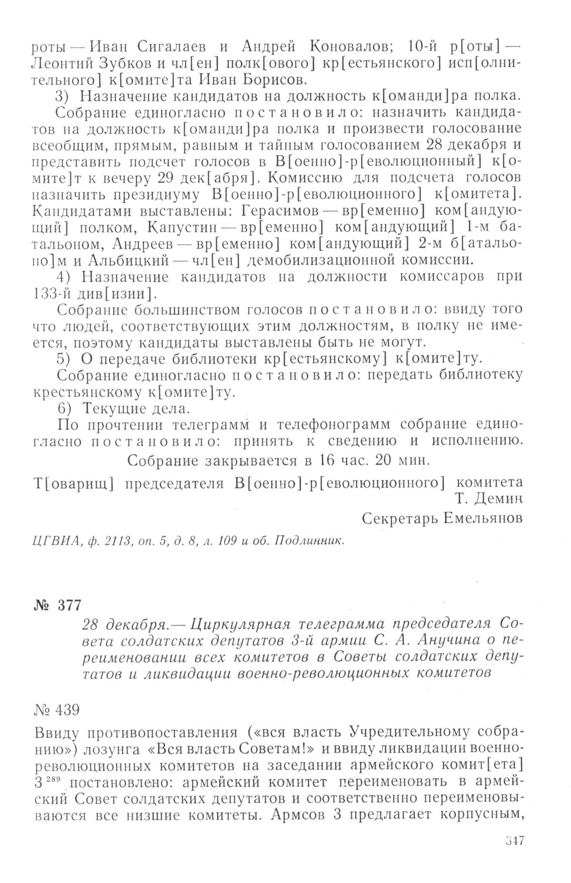 Циркулярная телеграмма председателя Совета солдатских депутатов 3-й армии С. А. Анучина о переименовании всех комитетов в Советы солдатских депутатов и ликвидации военно-революционных комитетов. 28 декабря 1917 г. // ЦГВИА, ф. 2218, оп. 10, д. 5, л. 537. Копия.