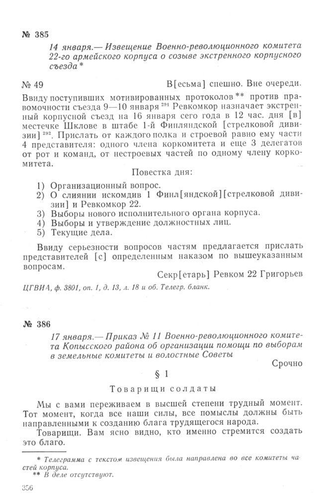 Приказ № 11 Военно-революционного комитета Копысского района об организации помощи по выборам в земельные комитеты и волостные Советы. 17 января 1918 г. // ЦГВИА, ф. 2222, оп. 9, д. 8, лл. 75—76. Подлинник.