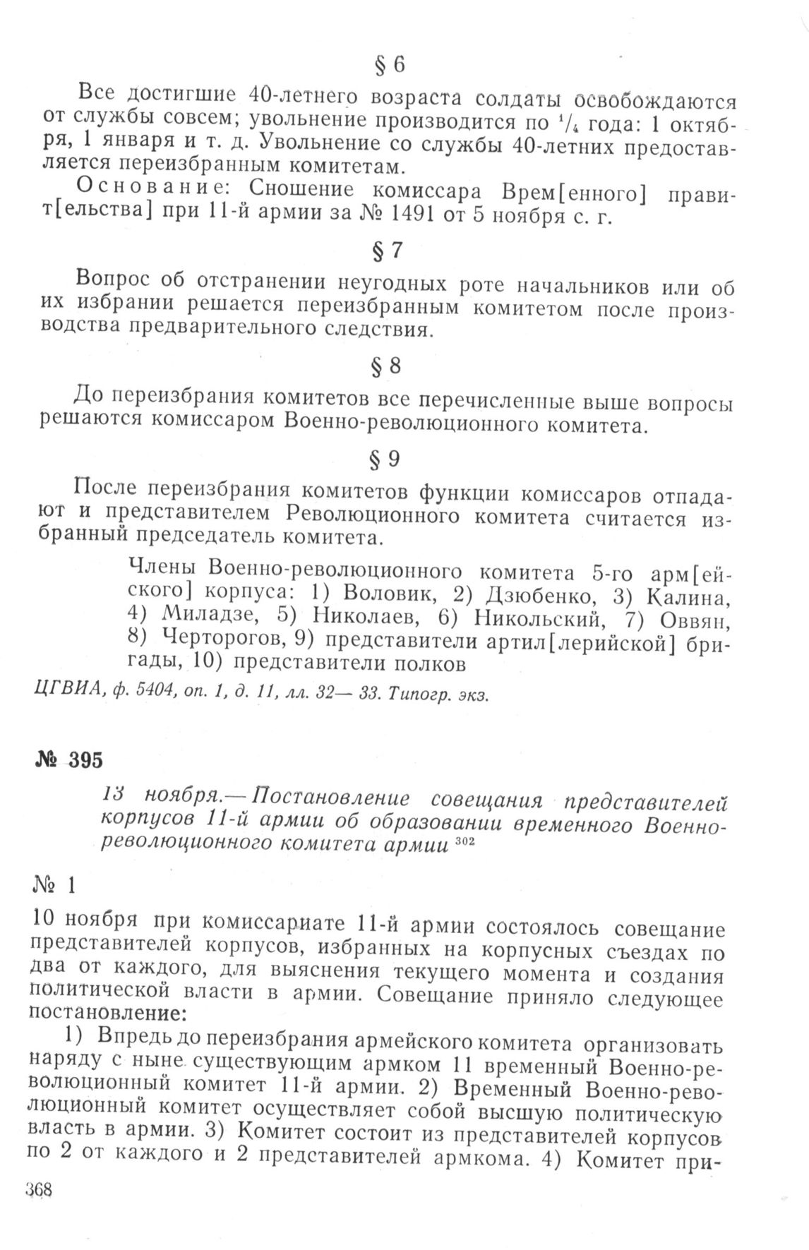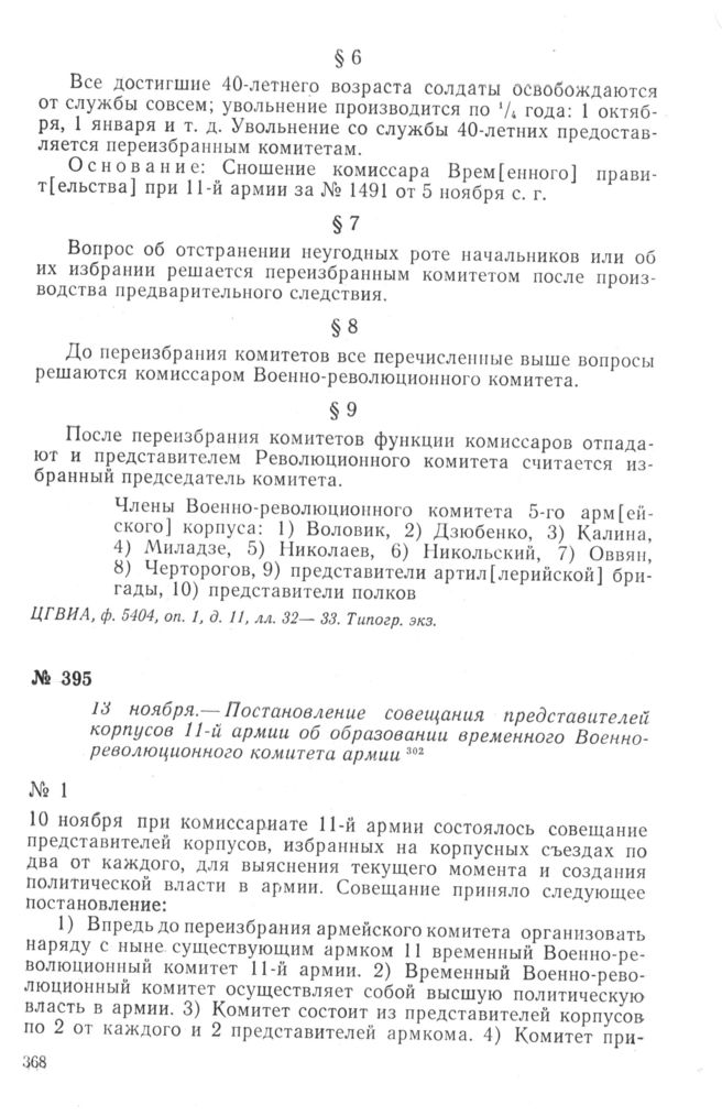 Постановление совещания представителей корпусов 11-й армии об образовании временного Военно-революционного комитета армии. 13 ноября 1917 г. // ЦГВИА, ф. 2067, оп. 1, д. 3828, ч. 1, л. 46 и об. Телегр. лента.