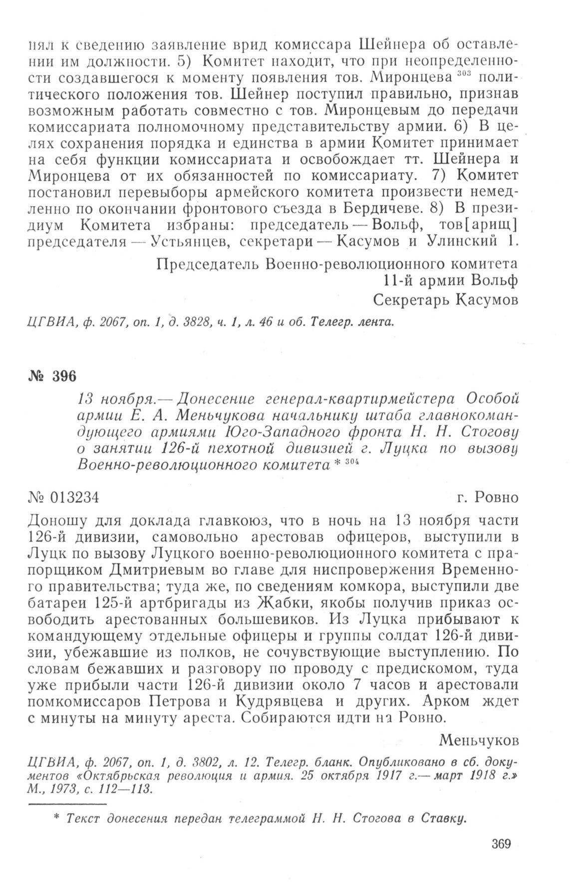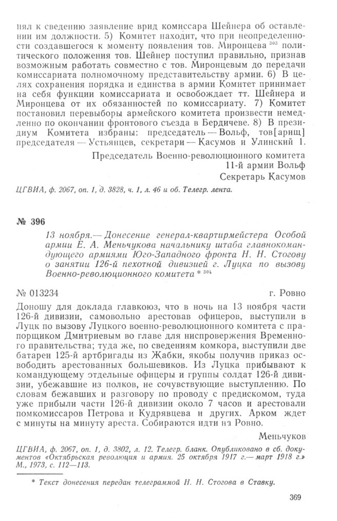 Донесение генерал-квартирмейстера Особой армии Е. А. Меньчукова начальнику штаба главнокомандующего армиями Юго-Западного фронта Н. Н. Стогову о занятии 126-й пехотной дивизией г. Луцка по вызову Военно-революционного комитета. 13 ноября 1917 г. // ЦГВИА, ф. 2067, оп. 1, д. 3802, л. 12. Телегр. бланк. Опубликовано в сб. документов «Октябрьская революция и армия. 25 октября 1917 г.— март 1918 г.» М., 1973, с. 112—113.