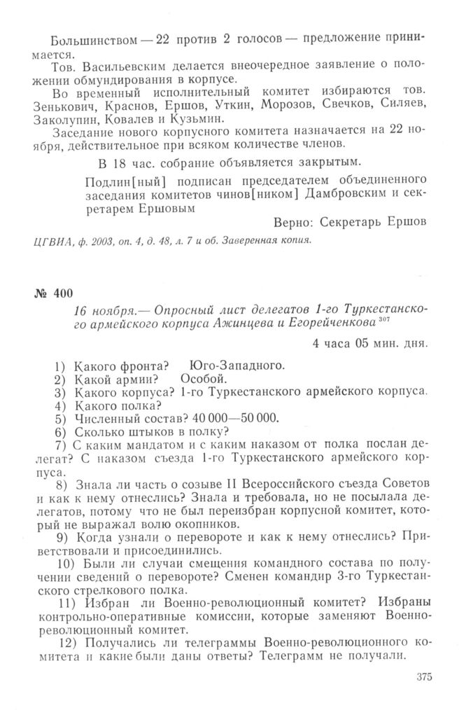 Опросный лист делегатов 1-го Туркестанского армейского корпуса Ажинцева и Егорейченкова. 16 ноября 1917 г. // ЦГАОР СССР, ф. 1236, оп. 1, д. 43, л. 44 и об. Подлинник. Опубликовано в сб. документов «Петроградский военно-революционный комитет», т. 3. М., 1967, с. 99—101.