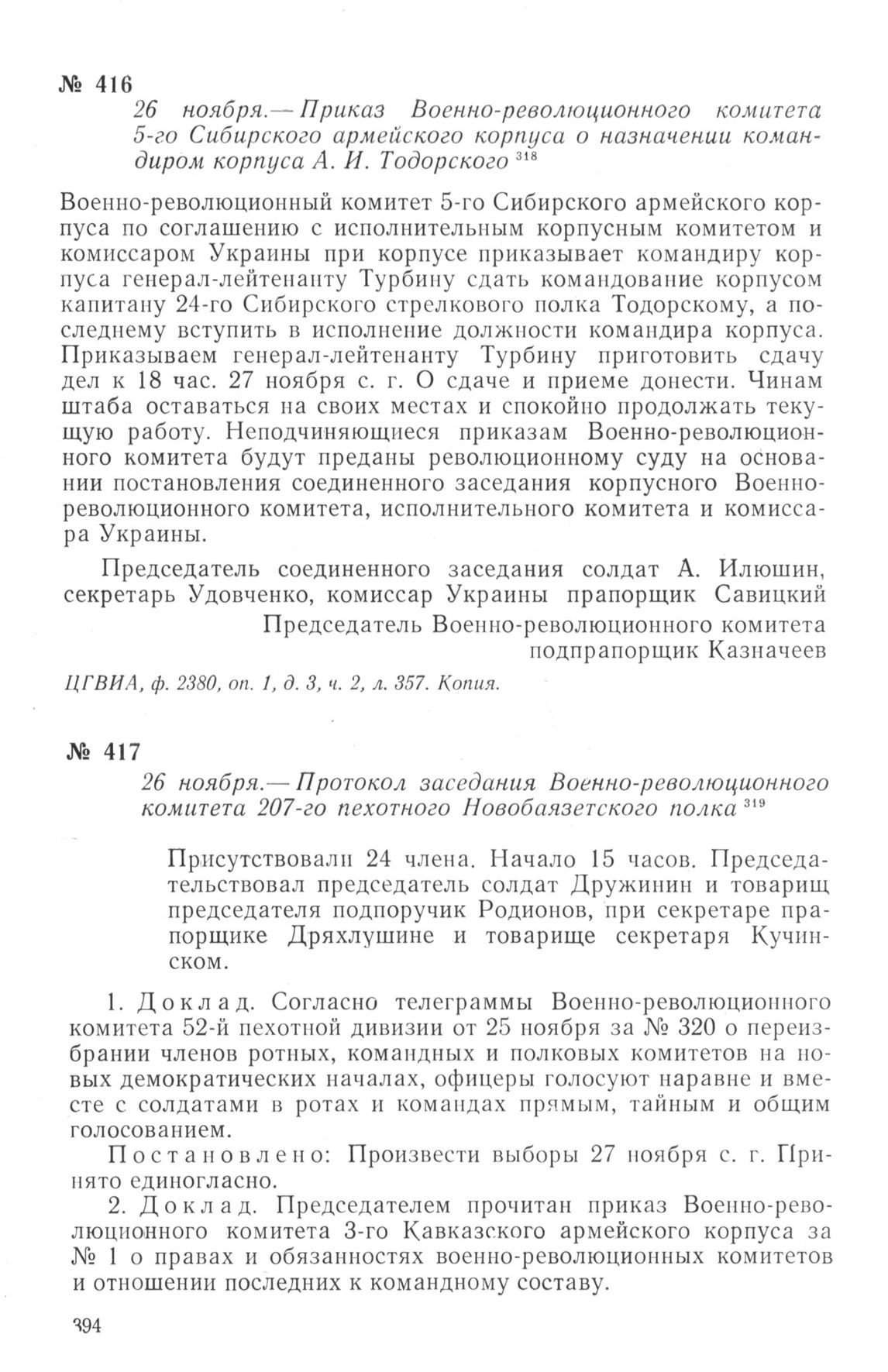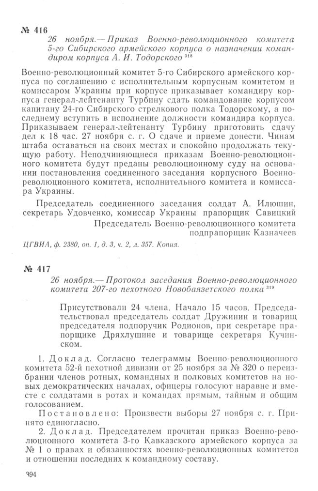 Протокол заседания Военно-революционного комитета 207-го пехотного Новобаязетского полка. 26 ноября 1917 г. // ЦГВИА, ф. 2695, оп. 1, д. 6, лл. 207 об.— 208. Заверенная копия.