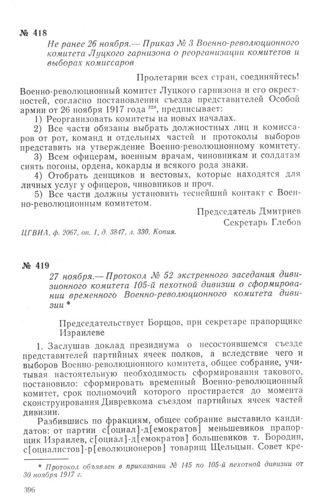 Приказ № 3 Военно-революционного комитета Луцкого гарнизона о реорганизации комитетов и выборах комиссаров. Не ранее 26 ноября 1917 г. // ЦГВИА, ф. 2067, оп. 1, д. 3847, л. 330. Копия.