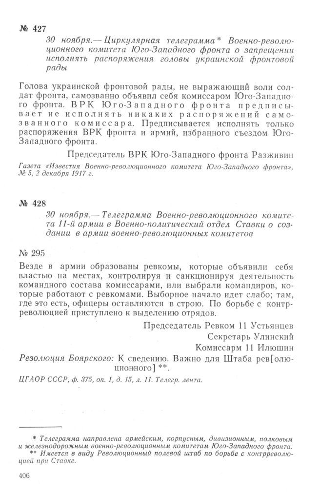 Телеграмма Военно-революционного комитета 11-й армии в Военно-политический отдел Ставки о создании в армии военно-революционных комитетов. 30 ноября 1917 г.