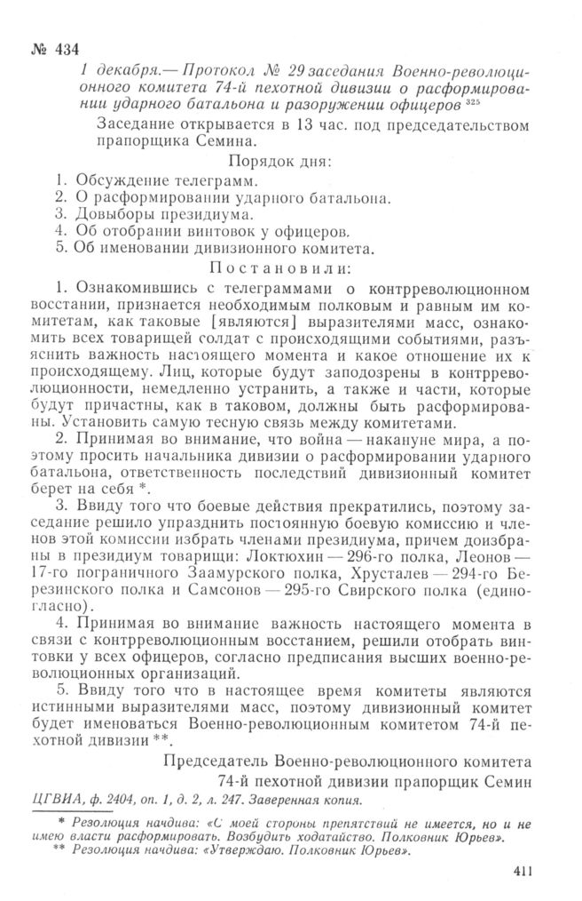 Протокол № 29 заседания Военно-революционного комитета 74-й пехотной дивизии о расформировании ударного батальона и разоружении офицеров. 1 декабря 1917 г. // ЦГВИА, ф. 2404, оп. 1, д. 2, л. 247. Заверенная копия.