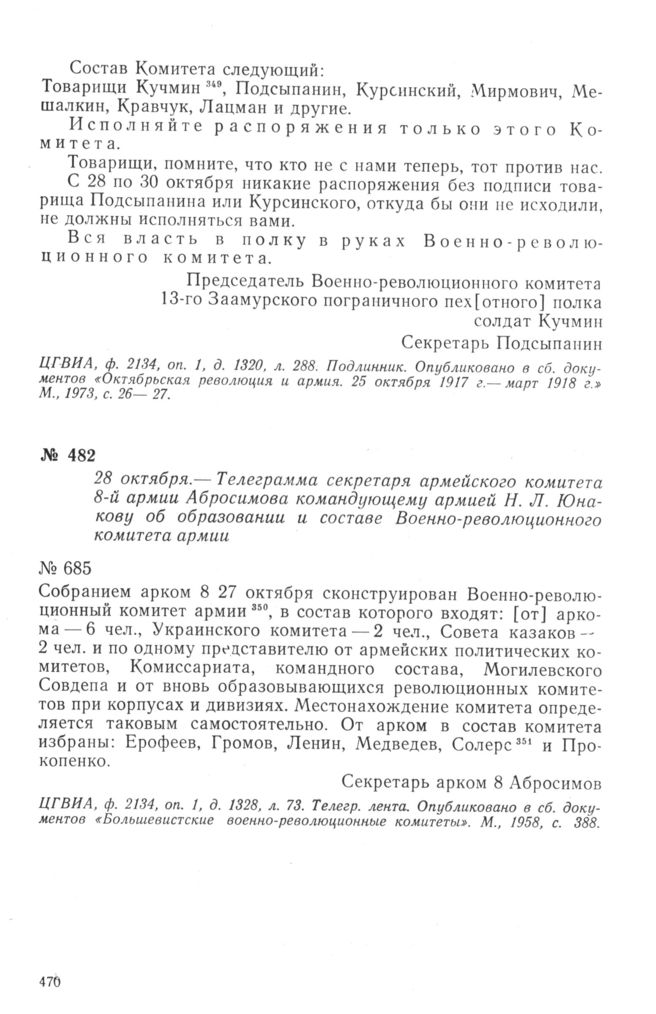 Телеграмма секретаря армейского комитета 8-й армии Абросимова командующему армией Н. Л. Юнакову об образовании и составе Военно-революционного комитета армии. 28 октября 1917 г. // ЦГВИА, ф. 2134, оп. 1, д. 1328, л. 73. Телегр. лента. Опубликовано в сб. документов «Большевистские военно-революционные комитеты». М., 1958, с. 388.