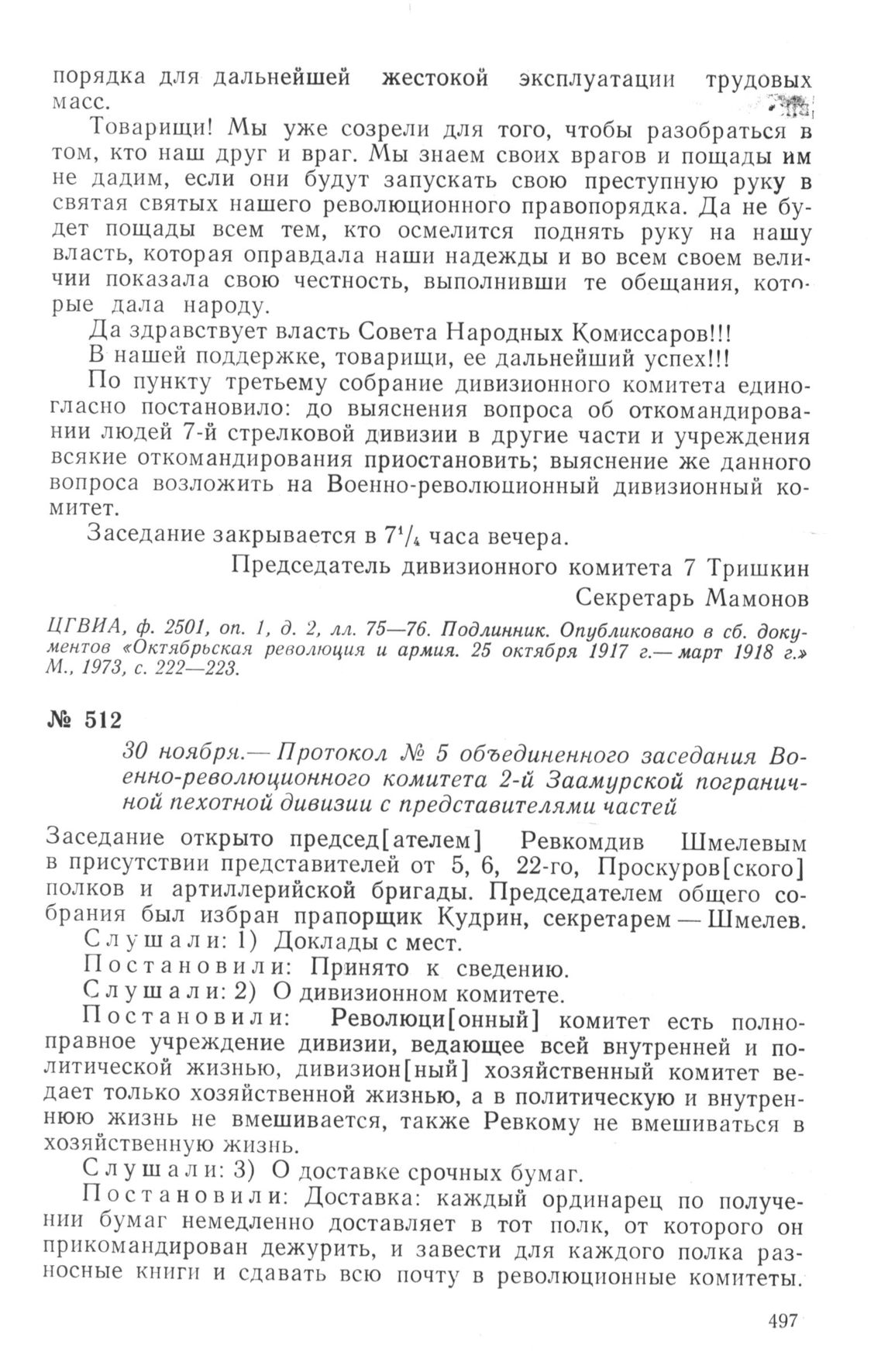 Протокол № 5 объединенного заседания Военно-революционного комитета 2-й Заамурской пограничной пехотной дивизии с представителями частей. 30 ноября 1917 г. // ЦГВИА, ф. 2244, оп. 6, д. 16, л. 382 и об. Копия.