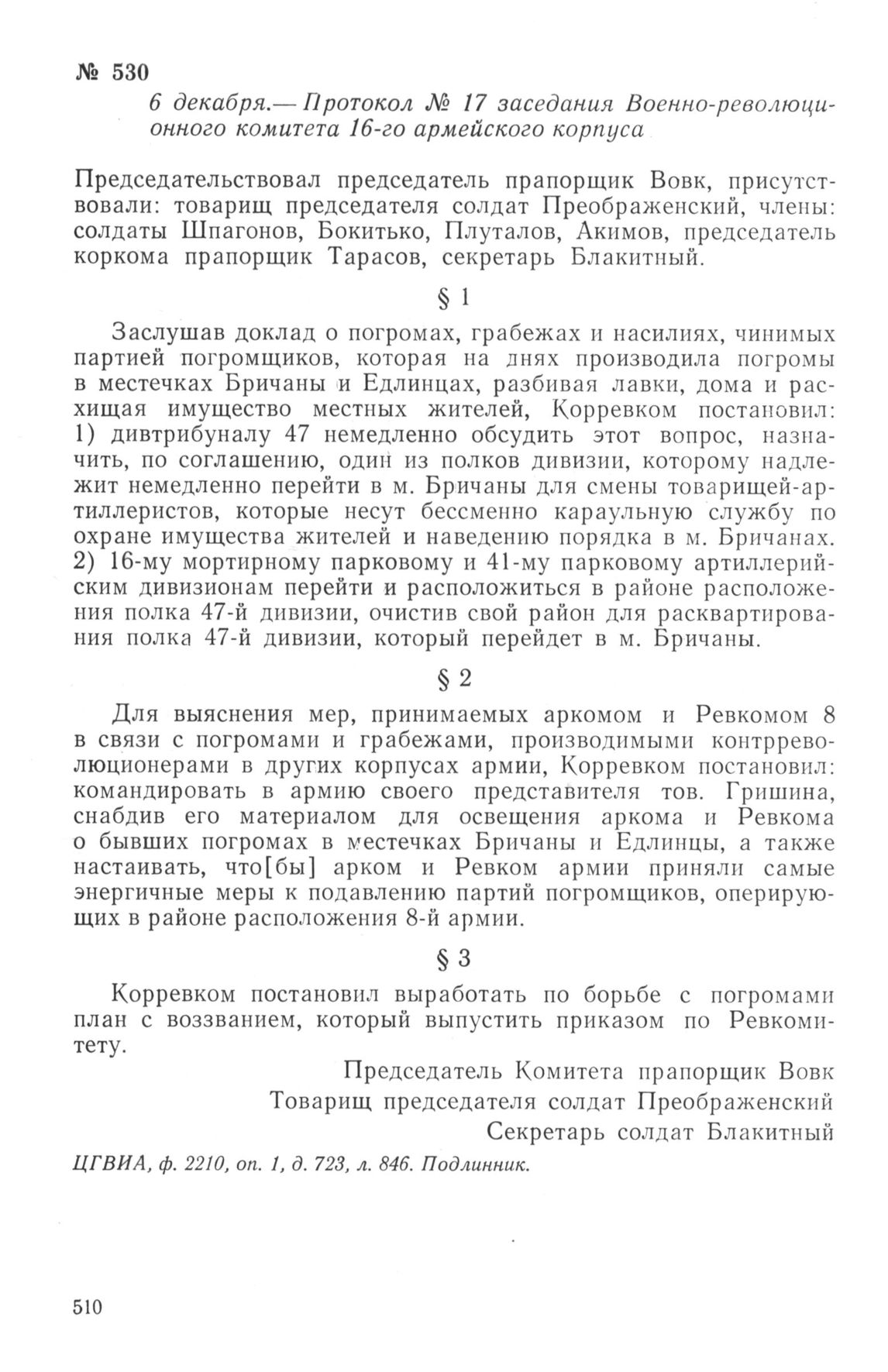Протокол № 17 заседания Военно-революционного комитета 16-го армейского корпуса. 6 декабря 1917 г. // ЦГВИА, ф. 2210, оп. 1, д. 723, л. 846. Подлинник.