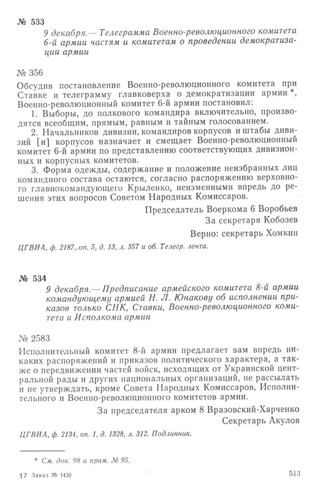 Телеграмма Военно-революционного комитета 6-й армии частям и комитетам о проведении демократизации армии. 9 декабря 1917 г. // ЦГВИА, ф. 2187, оп. 5, д. 13, л. 357 и об. Телегр. лента.