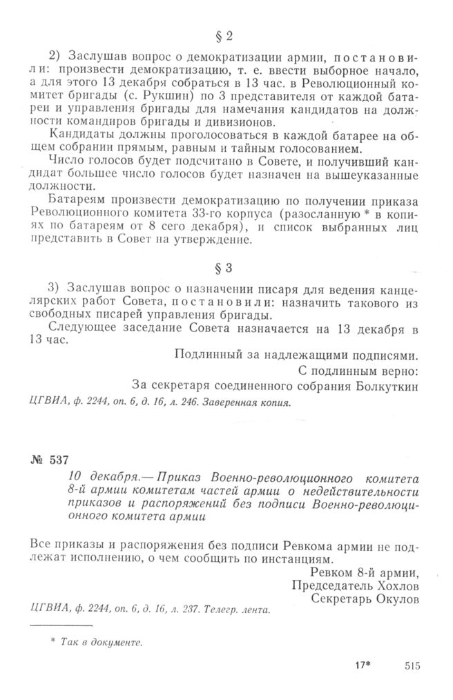 Приказ Военно-революционного комитета 8-й армии комитетам частей армии о недействительности приказов и распоряжений без подписи Военно-революционного комитета армии. 10 декабря 1917 г.
