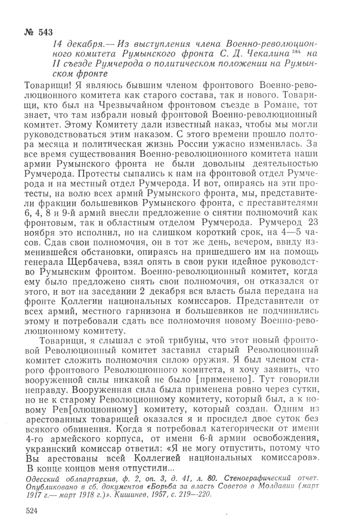 Из выступления члена Военно-революционного комитета Румынского фронта С. Д. Чекалина на II съезде Румчерода о политическом положении на Румынском фронте. 14 декабря 1917 г. // Одесский облпартархив, ф. 2, оп. 3, д. 41, л. 80. Стенографический отчет. Опубликовано в сб. документов «Борьба за власть Советов в Молдавии (март 1917 г.— март 1918 г.)». Кишинев, 1957, с. 219—220.