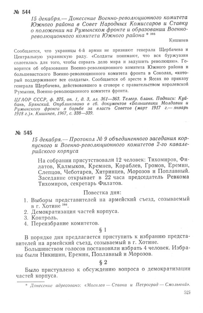 Донесение Военно-революционного комитета Южного района в Совет Народных Комиссаров и Ставку о положении на Румынском фронте и образовании Военно-революционного комитета Южного района. 15 декабря 1917 г. // ЦГАОР СССР, ф. 375, оп. 1, д. 3, лл. 361—363. Телегр. бланк. Опубликовано в сб. документов «Большевики Молдавии и Румынского фронта в борьбе за власть Советов (март 1917 г.— январь 1918 г.)». Кишинев, 1967, с. 338—339.