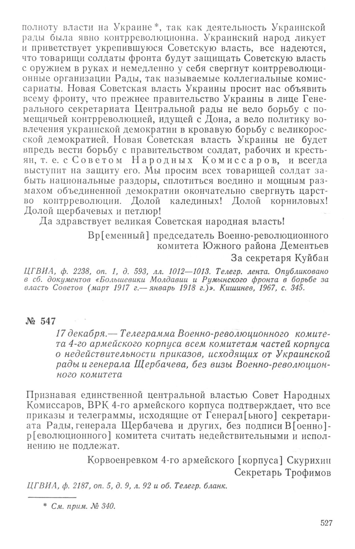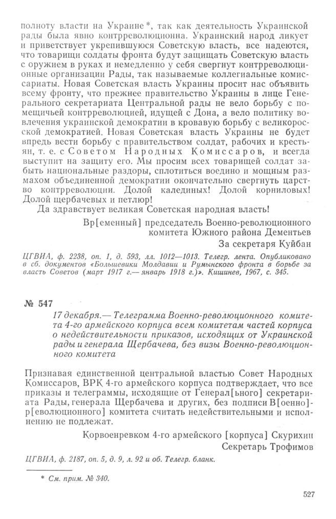 Телеграмма Военно-революционного комитета 4-го армейского корпуса всем комитетам частей корпуса о недействительности приказов, исходящих от Украинской рады и генерала Щербачева, без визы Военно-революционного комитета. 17 декабря 1917 г. // ЦГВИА, ф. 2187, оп. 5, д. 9, л. 92 и об. Телегр. бланк.