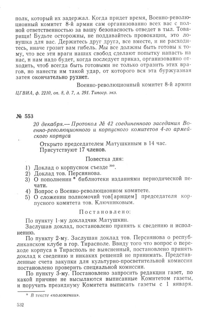 Протокол № 42 соединенного заседания Военно-революционного и корпусного комитетов 4-го армейского корпуса. 20 декабря 1917 г. // ЦГВИА, ф. 2187, оп. 5, д. 10, л. 333 и об. Копия.