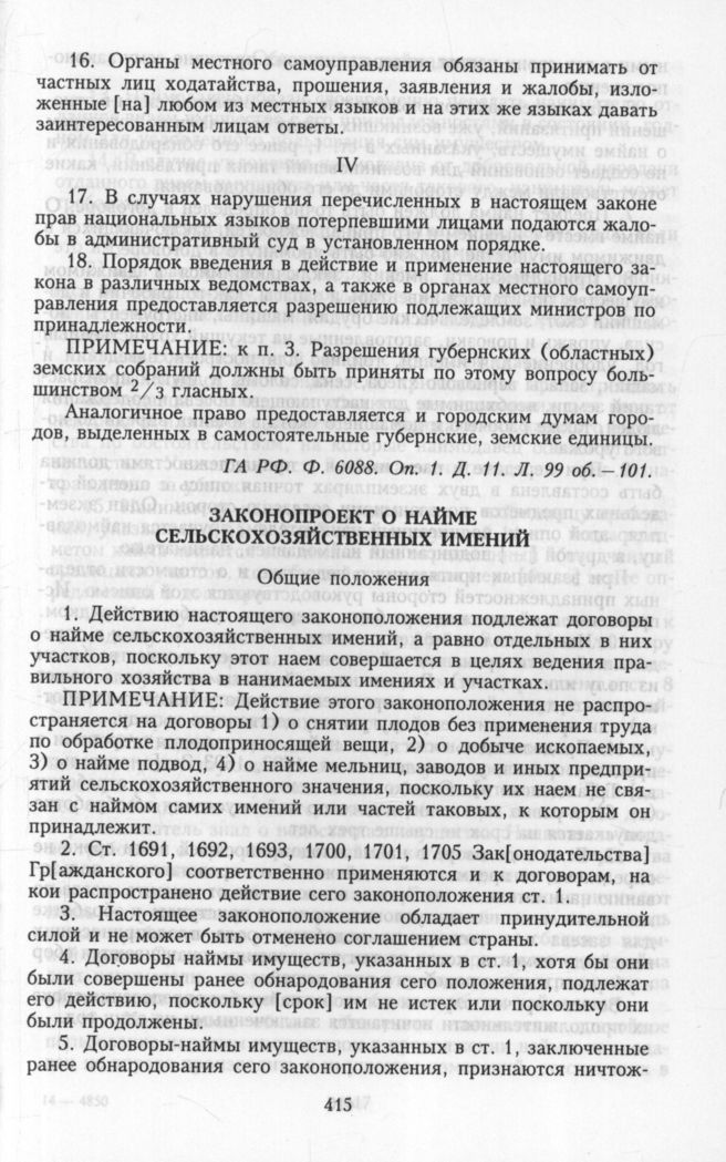 Всероссийский Национальный Центр. I. Программы. Законопроекты и законодательные предложения Национального Центра. Законопроект о найме сельскохозяйственных имений