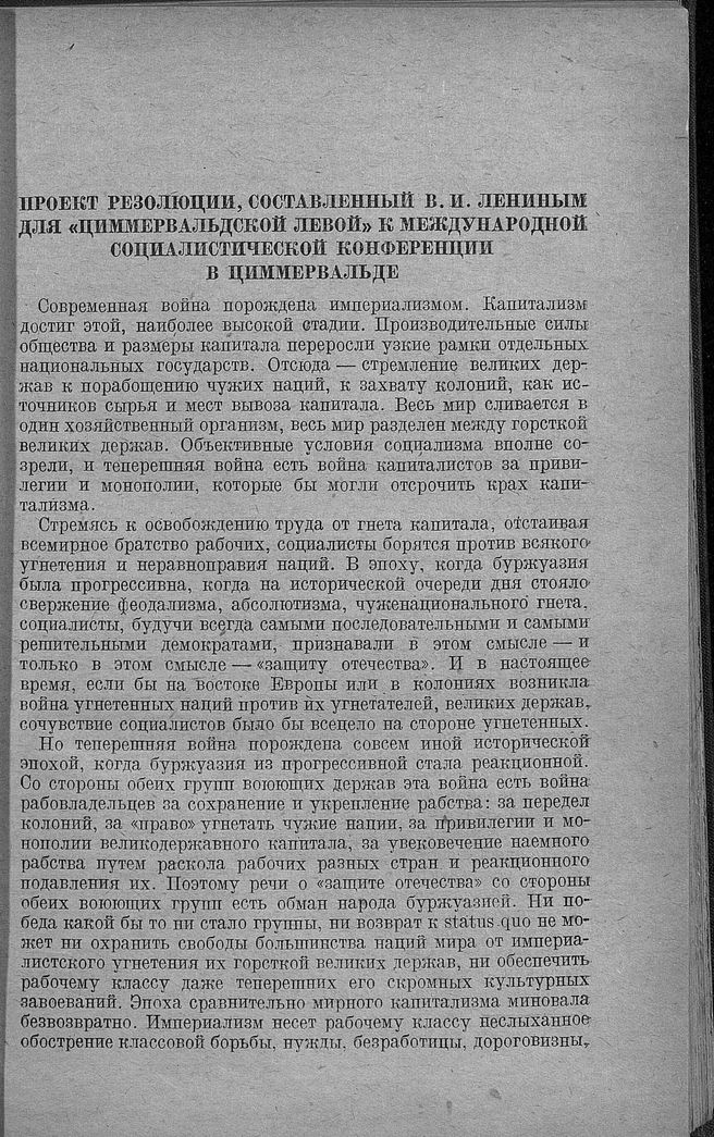Проект резолюции, составленный В. И. Лениным для «Циммервальдской левой» к Международной социалистической конференции в Циммервальде. Август 1915 г. // Впервые опубликовано в 1930 г. в Ленинском сборнике т. XIV, стр.166-169. Печатается по тексту «Ленинского сборника».