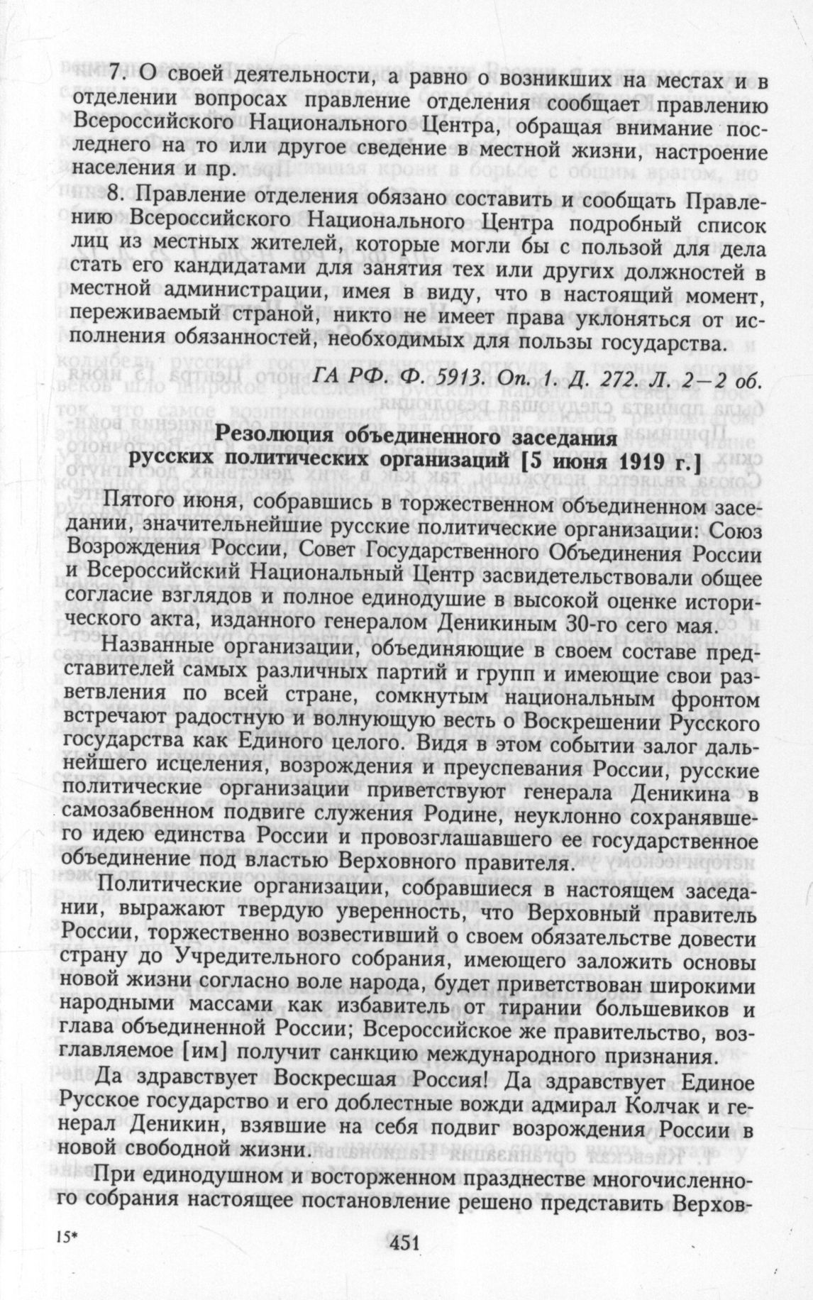 Всероссийский Национальный Центр. II. Записки, резолюции, обращения, письма. Резолюция объединенного заседания русских политических организаций [5 июня 1919 г.] // ЦА ФСБ РФ. Н-206. Т. 25. Л. 12.