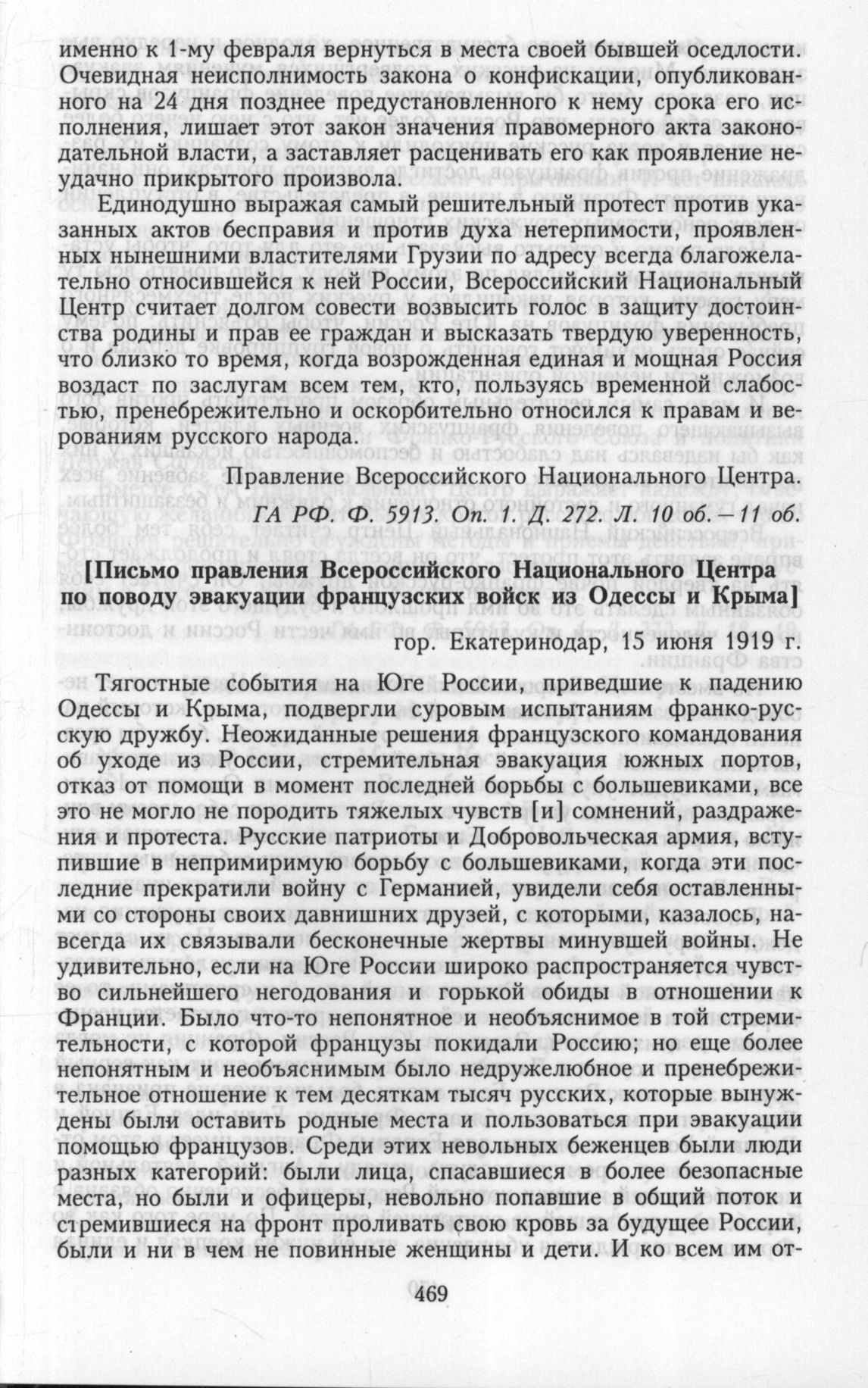 Всероссийский Национальный Центр. II. Записки, резолюции, обращения, письма. [Письмо Правления Всероссийского Национального Центра по поводу эвакуации французских войск из Одессы и Крыма] гор. Екатеринодар, 15 июня 1919 г. // ГА РФ. Ф. 5913. Оп. 1. Д. 272. Л. 18-19.
