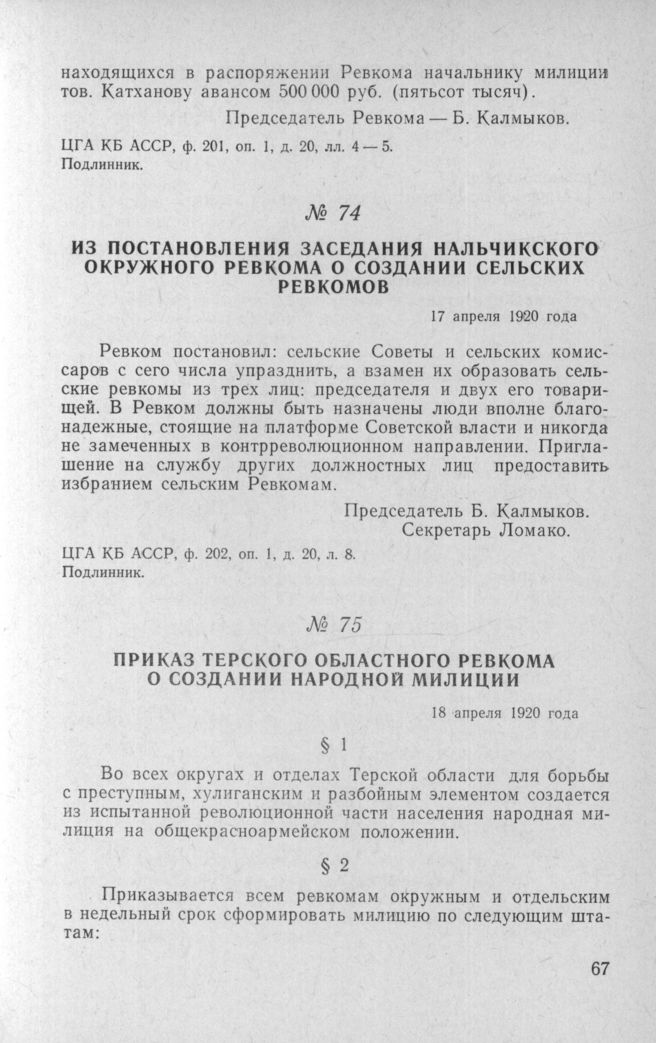 Приказ Терского областного Ревкома о создании Народной Милиции. 18 апреля 1920 года // ЦГА ЧИ АССР, ф. 73, д. 10, лл. 17-18. Типографский экз.