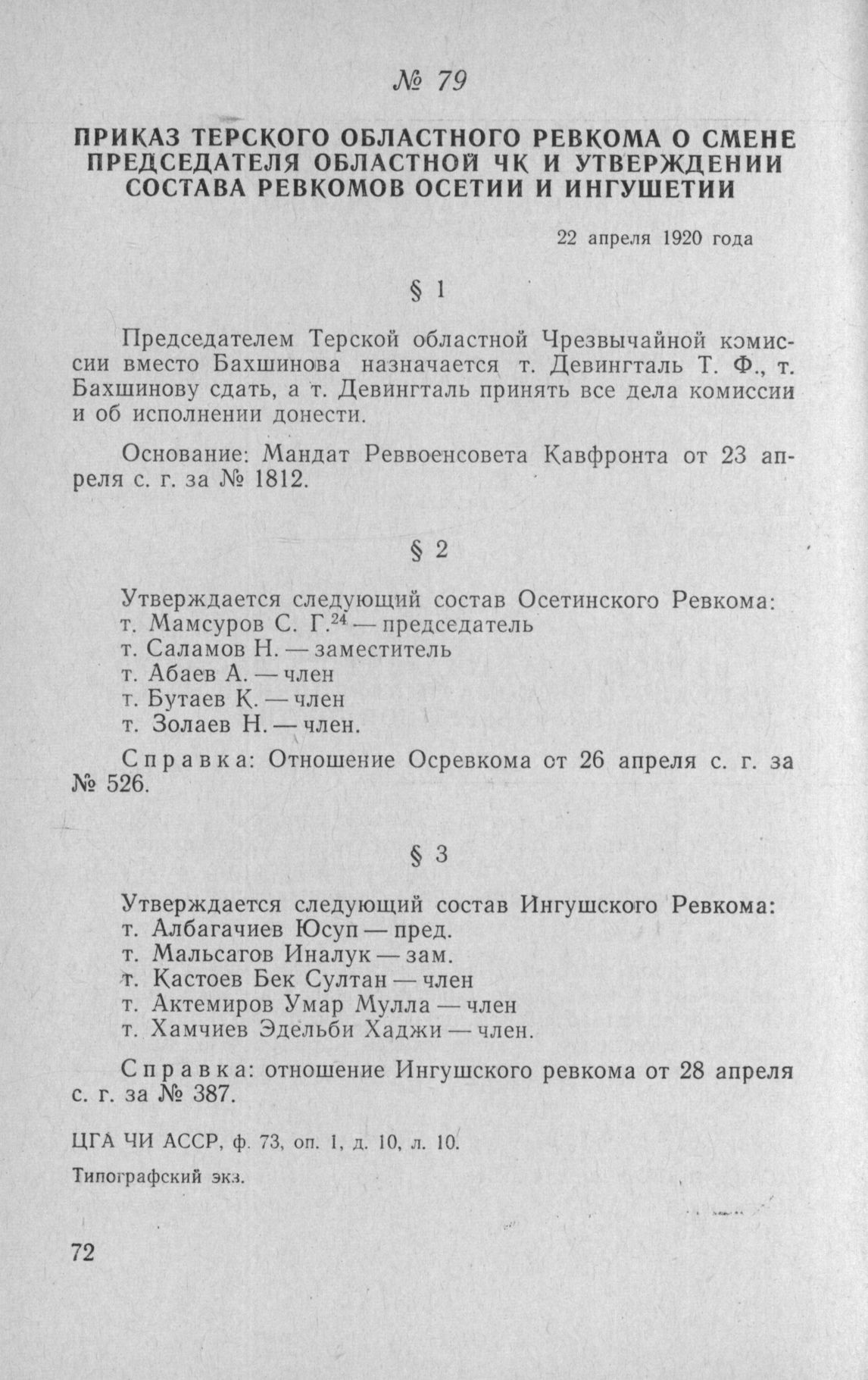 Приказ Терского областного Ревкома о смене председателя областной ЧК и утверждении состава Ревкомов Осетии и Ингушетии. 22 апреля 1920 года // ЦГА ЧИ АССР, ф. 73, оп. 1, д. 10, л. 10. Типографский экз.