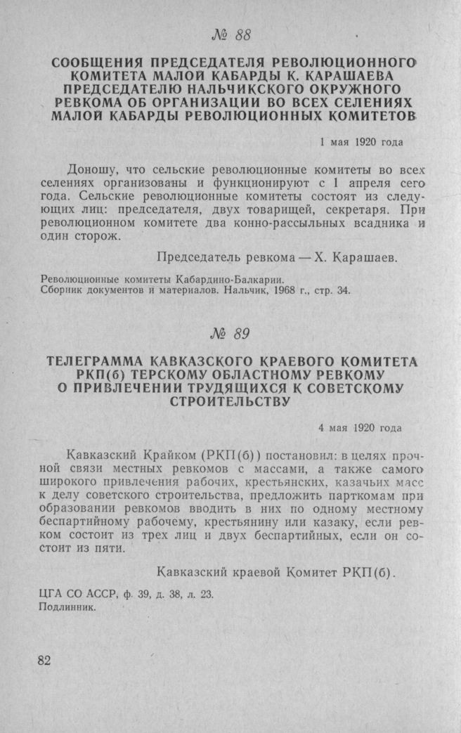 Сообщения председателя Революционного Комитета Малой Кабарды К. Карашаева председателю Нальчикского окружного Ревкома об организации во всех селениях Малой Кабарды Революционных Комитетов. 1 мая 1920 года // Революционные комитеты Кабардино-Балкарии. Сборник документов и материалов. Нальчик, 1968 г., стр. 34.