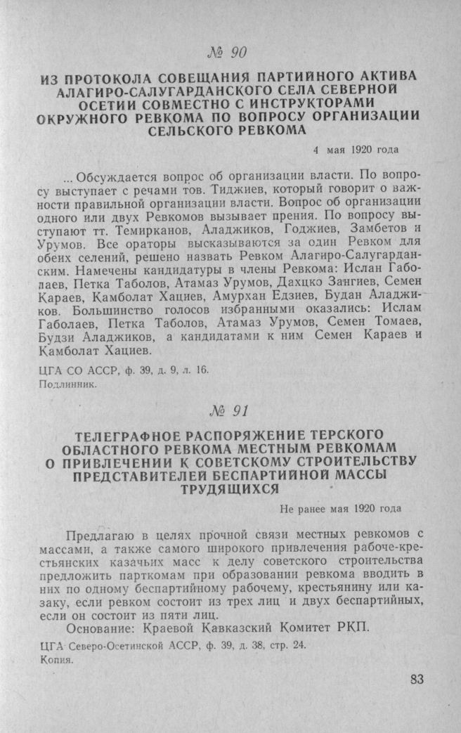 Из протокола совещания партийного актива Алагиро-Салугарданского села Северной Осетии совместно с инструкторами окружного Ревкома по вопросу организации сельского Ревкома. 4 мая 1920 года // ЦГА СО АССР, ф. 39, д. 9, л. 16. Подлинник.