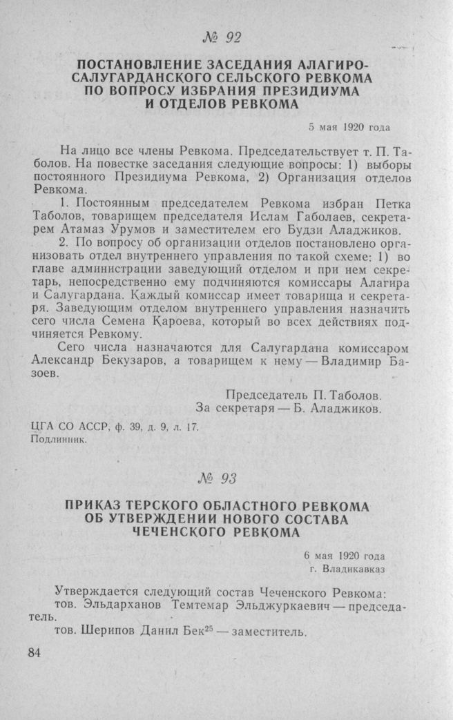 Постановление заседания Алагиро-Салугарданского сельского Ревкома по вопросу избрания президиума и отделов Ревкома. 5 мая 1920 года // ЦГА СО АССР, ф. 39, д. 9, л. 17. Подлинник.
