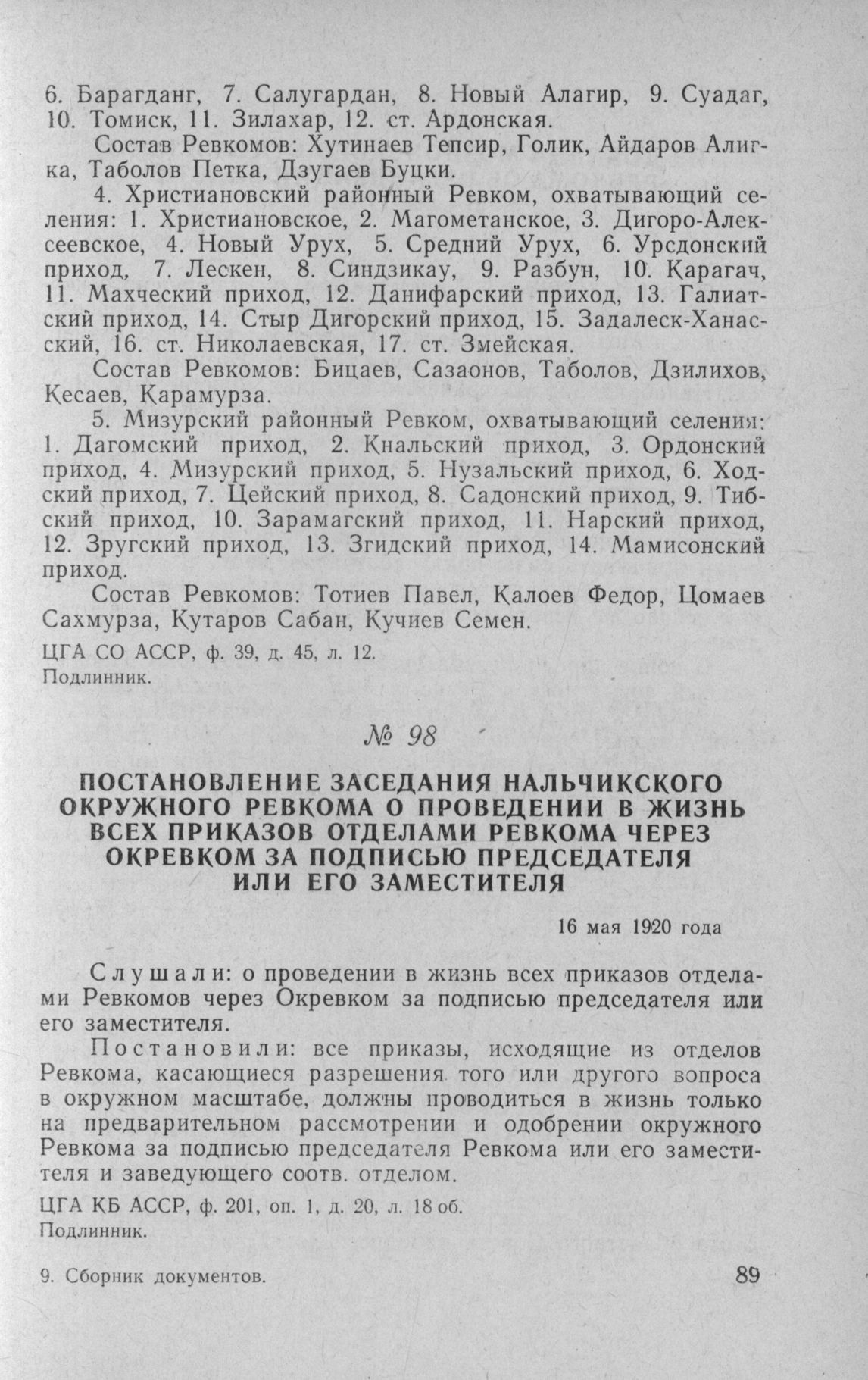 Постановление заседания Нальчикского окружного Ревкома о проведении в жизнь всех приказов отделами Ревкома через ОкРевком за подписью председателя или его заместителя. 16 мая 1920 года