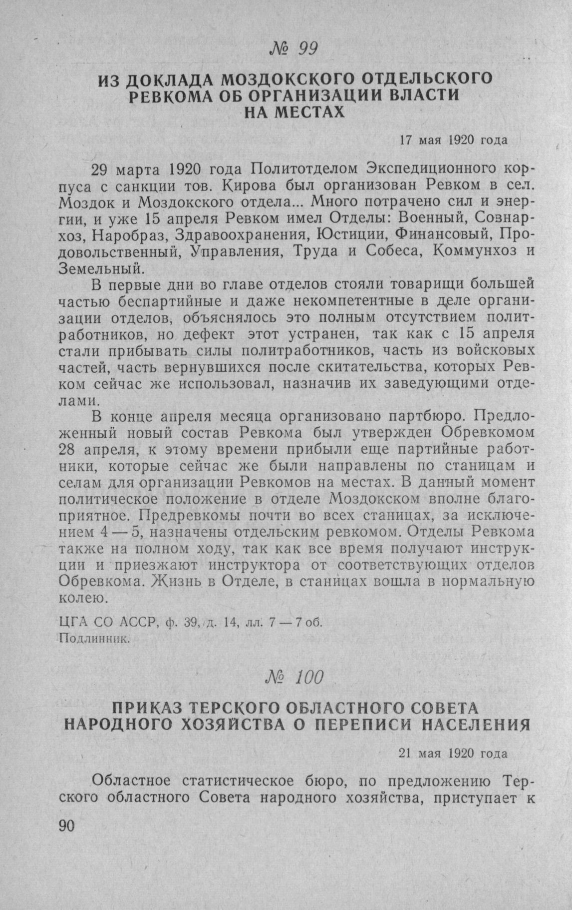 Приказ Терского областного совета народного хозяйства о переписи населения. 21 мая 1920 года // ЦГА ЧИ АССР, ф. 73, д. 17, л. 2. Типографский экз.