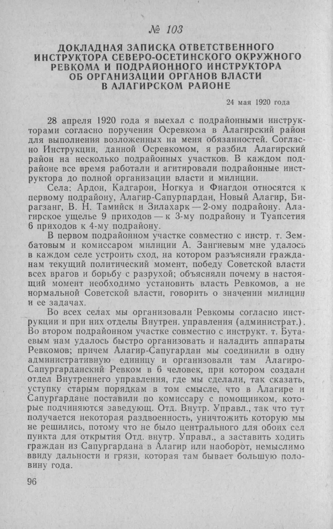 Докладная записка ответственного инструктора Северо-Осетинского окружного Ревкома и подрайонного инструктора об организации органов власти в Алагирском районе. 24 мая 1920 года