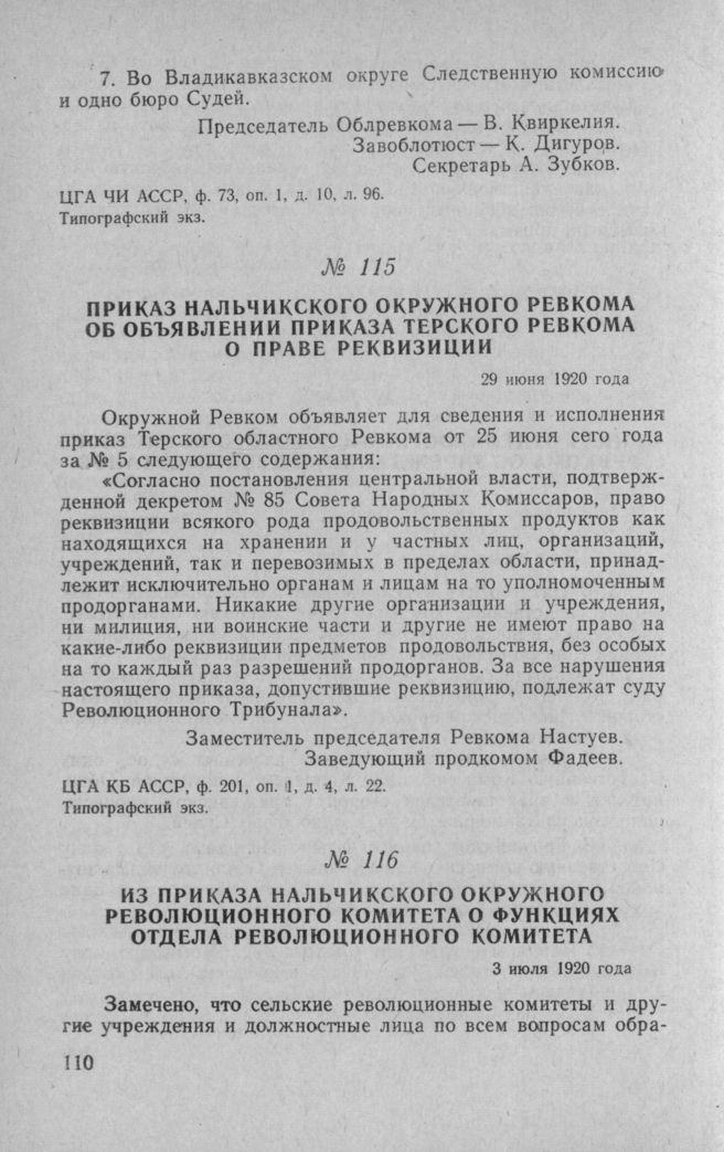 Из приказа Нальчикского окружного Революционного Комитета о функциях отдела Революционного Комитета. 3 июля 1920 года // ЦГА КБ АССР, ф. 201, оп. 1, д. 4, лл 43-44. Типографский экз.