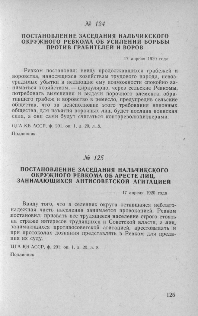 Постановление заседания Нальчикского окружного Ревкома об усилении борьбы против грабителей и воров. 17 апреля 1920 года // ЦГА КБ АССР, ф. 201, оп. 1, д. 20, л. 8. Подлинник.