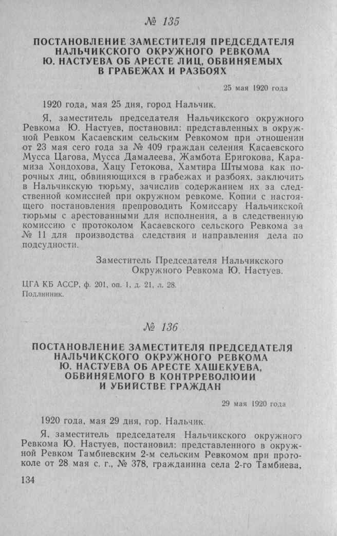 Постановление заместителя председателя Нальчикского окружного Ревкома Ю. Настуева об аресте лиц, обвиняемых в грабежах и разбоях. 25 мая 1920 года
