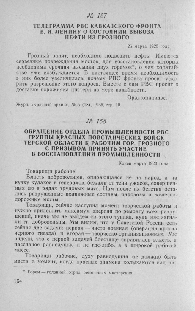 Обращение отдела промышленности РВС группы Красных повстанческих войск Терской области к рабочим гор. Грозного с призывом принять участие в восстановлении промышленности. Конец марта 1920 года