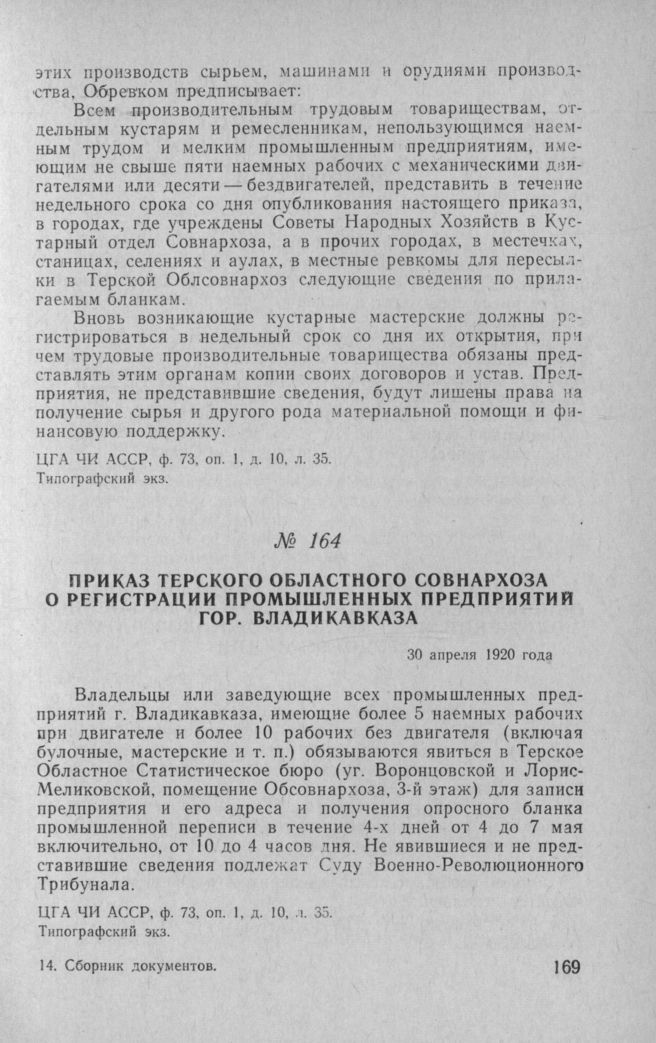 Приказ Терского областного совнархоза о регистрации промышленных предприятий гор. Владикавказа. 30 апреля 1920 года // ЦГА ЧИ АССР, ф. 73, оп. 1, д. 10, л. 35. Типографский экз.