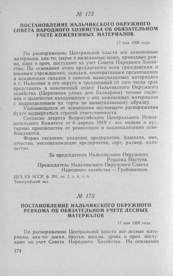 Постановление Нальчикского окружного Ревкома об обязательном учете лесных материалов. 17 мая 1920 года // ЦГА КБ АССР, ф. 201, оп. 1, д. 4, л. 7. Типографский экз.