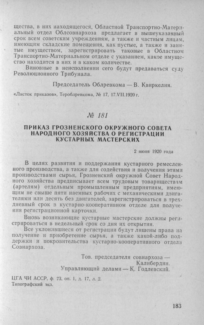 Приказ Грозненского окружного совета народного хозяйства о регистрации кустарных мастерских. 2 июня 1920 года // ЦГА ЧИ АССР, ф. 73, оп. 1, д. 17, л. 2. Типографский экз.
