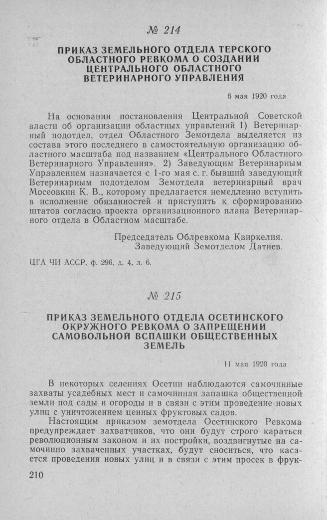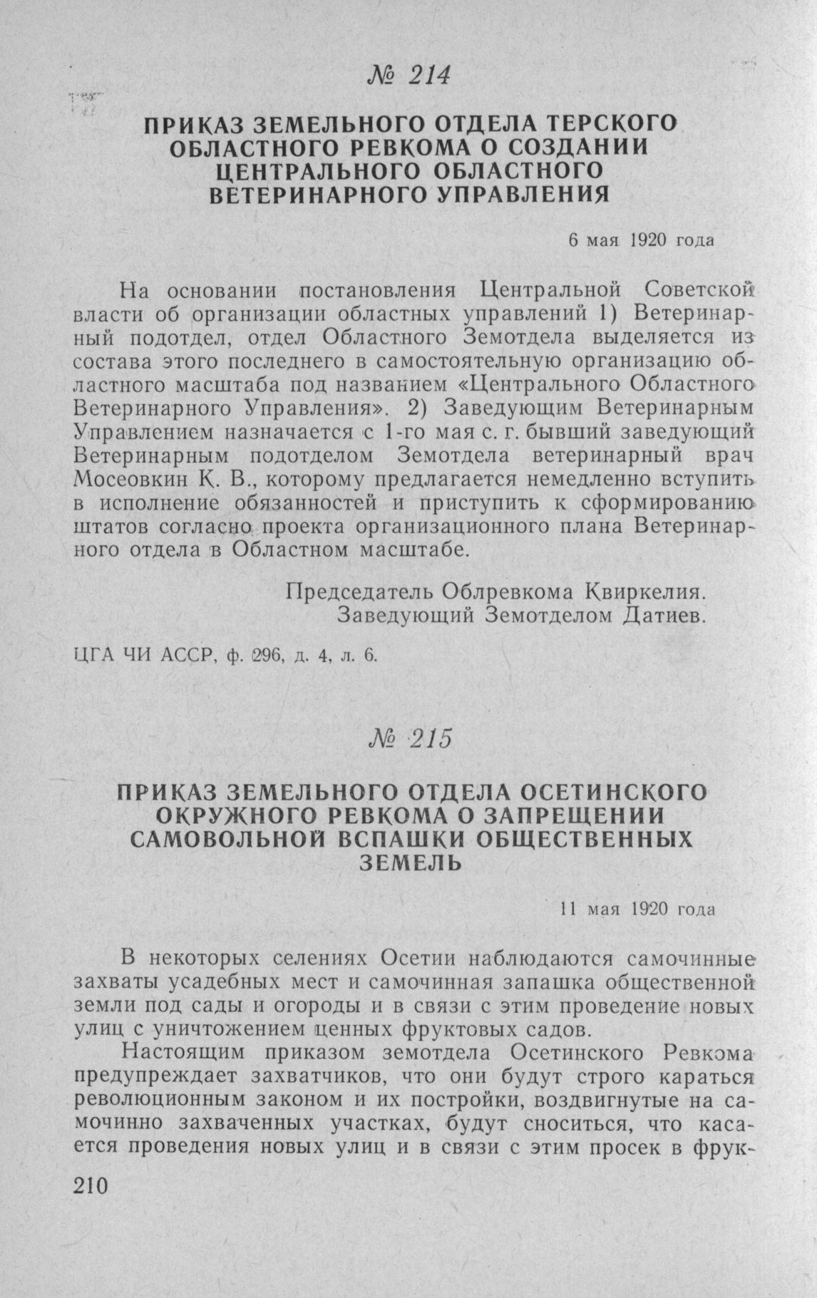 Приказ земельного отдела Осетинского окружного Ревкома о запрещении самовольной вспашки общественных земель. 11 мая 1920 года // ЦГА СО АССР, ф. 39, д. 5, л. 25. Типографский экз.