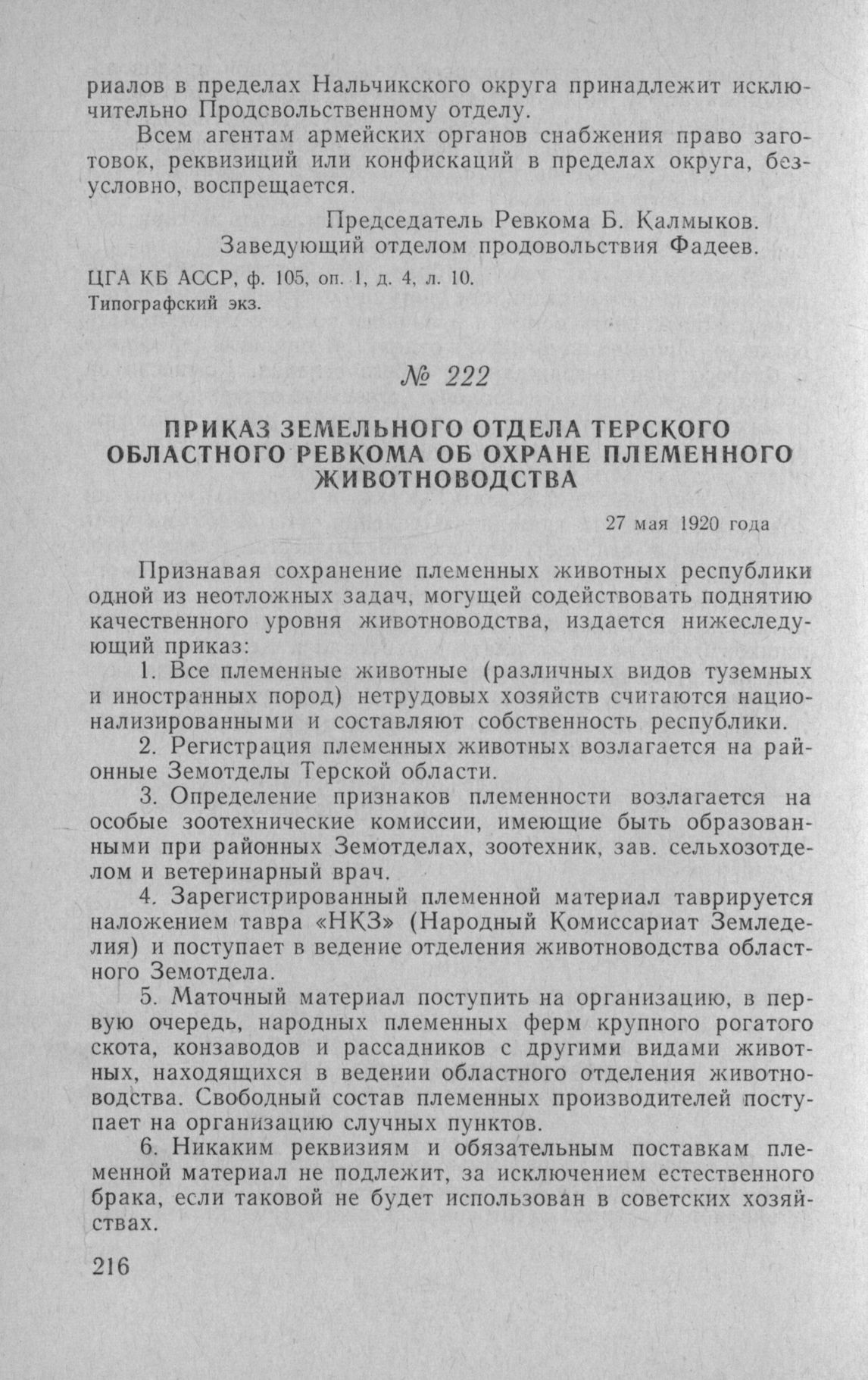 Приказ земельного отдела Терского областного Ревкома об охране племенного животноводства. 27 мая 1920 года // ЦГА ЧИ АССР, ф. 296, оп. 1, д. 2, л. 5. Типографский экз.