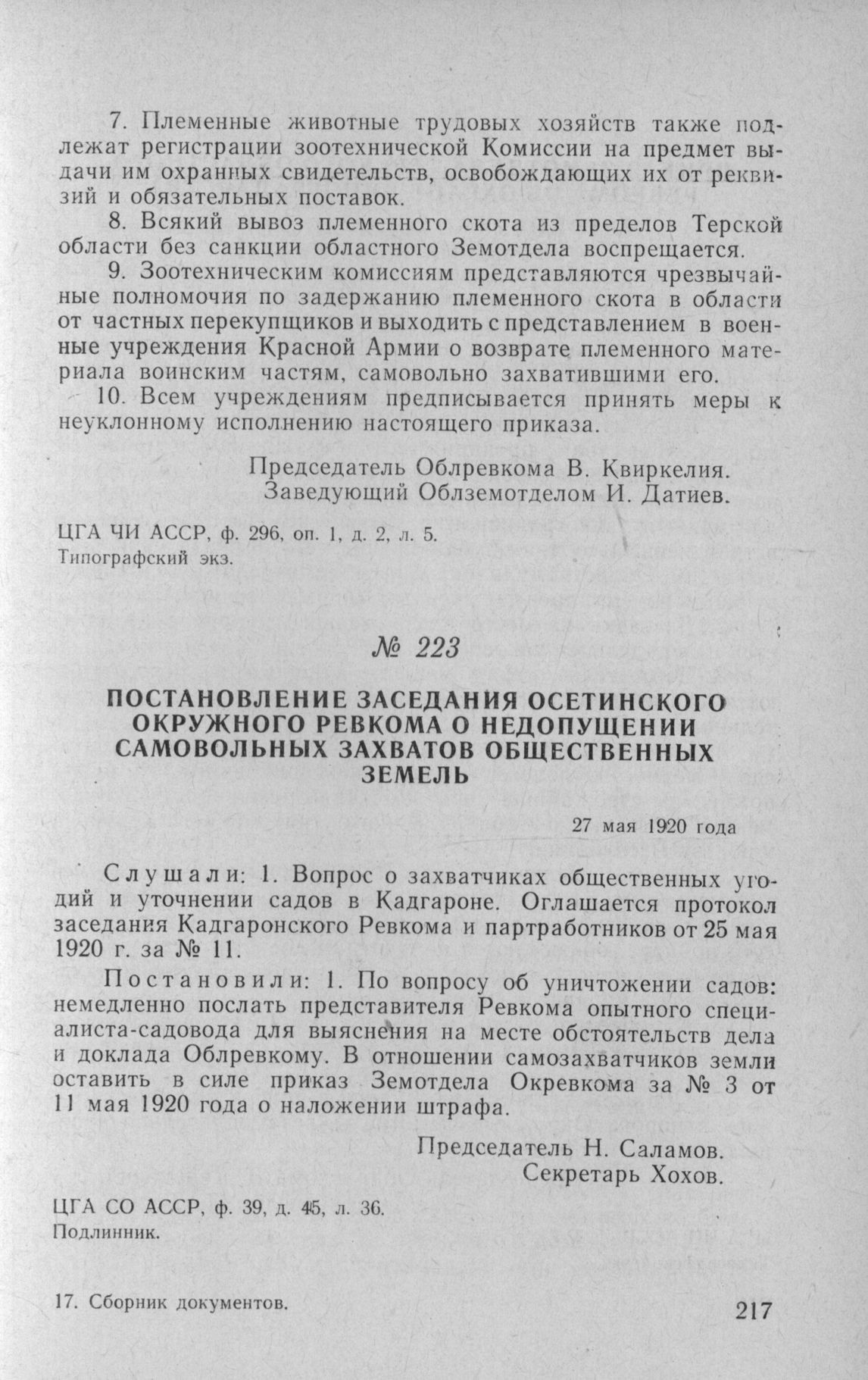 Постановление заседания Осетинского окружного Ревкома о недопущении самовольных захватов общественных земель. 27 мая 1920 года // ЦГА СО АССР, ф. 39, д. 46, л. 36. Подлинник.