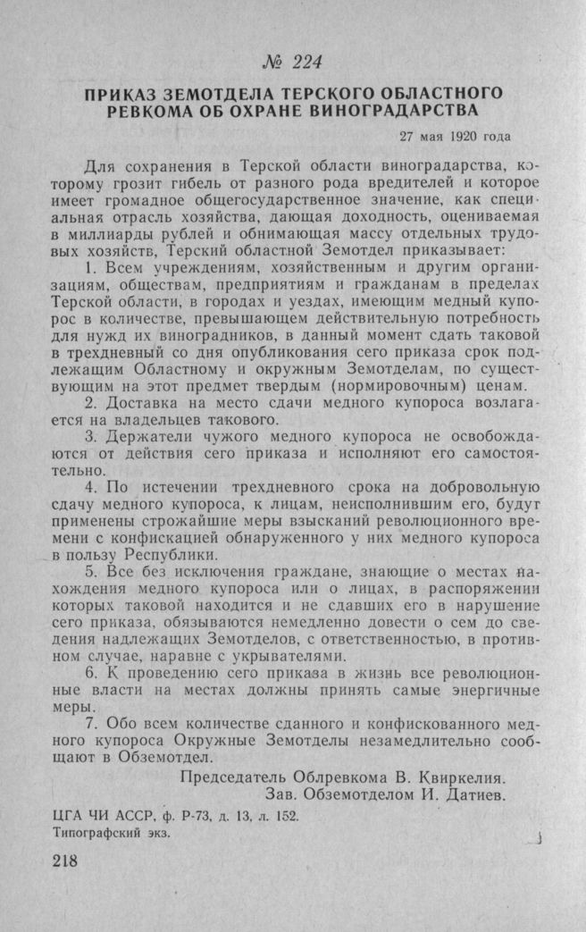 Приказ земотдела Терского областного Ревкома об охране виноградарства. 27 мая 1920 года // ЦГА ЧИ АССР, ф. Р-73, д. 13, л. 152. Типографский экз.