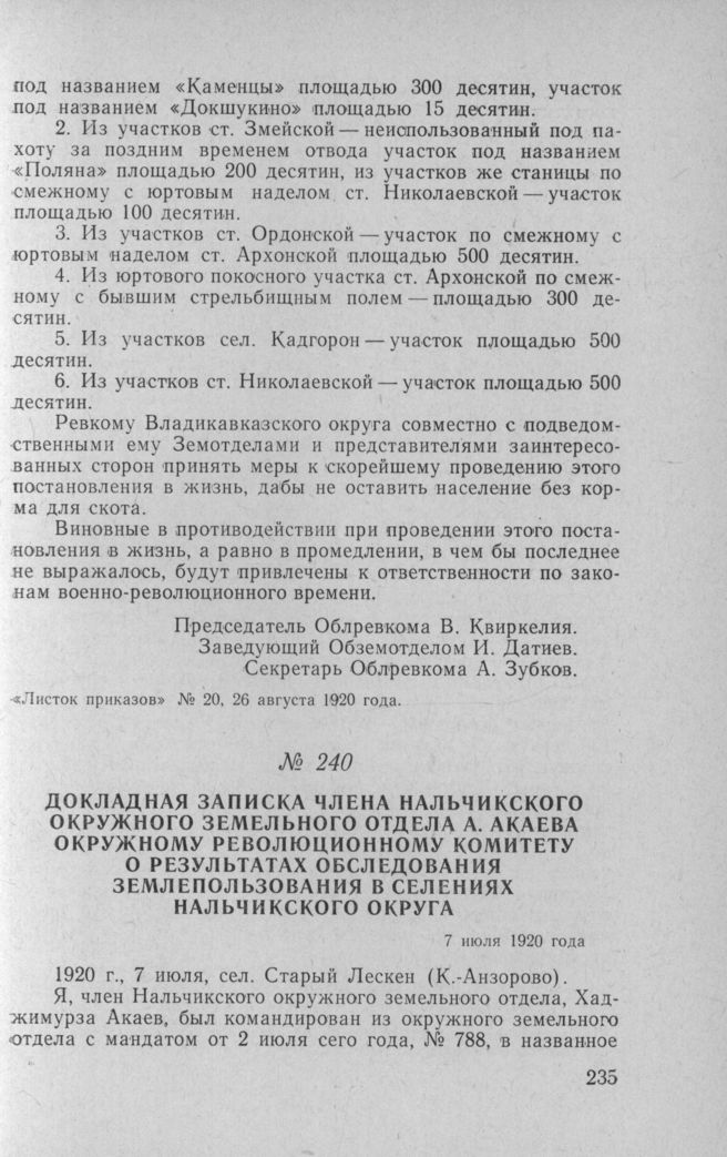 Докладная записка члена Нальчикского окружного земельного отдела А. Акаева окружному Революционному Комитету о результатах обследования землепользования в селениях Нальчикского округа. 7 июля 1920 года