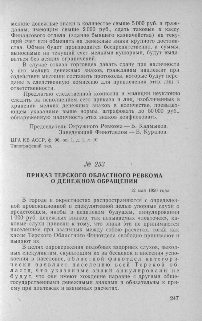 Приказ Терского областного Ревкома о денежном обращении. 12 мая 1920 года // ЦГА ЧИ АССР. ф. 73, д. 10, л. 40. Типографский экз.