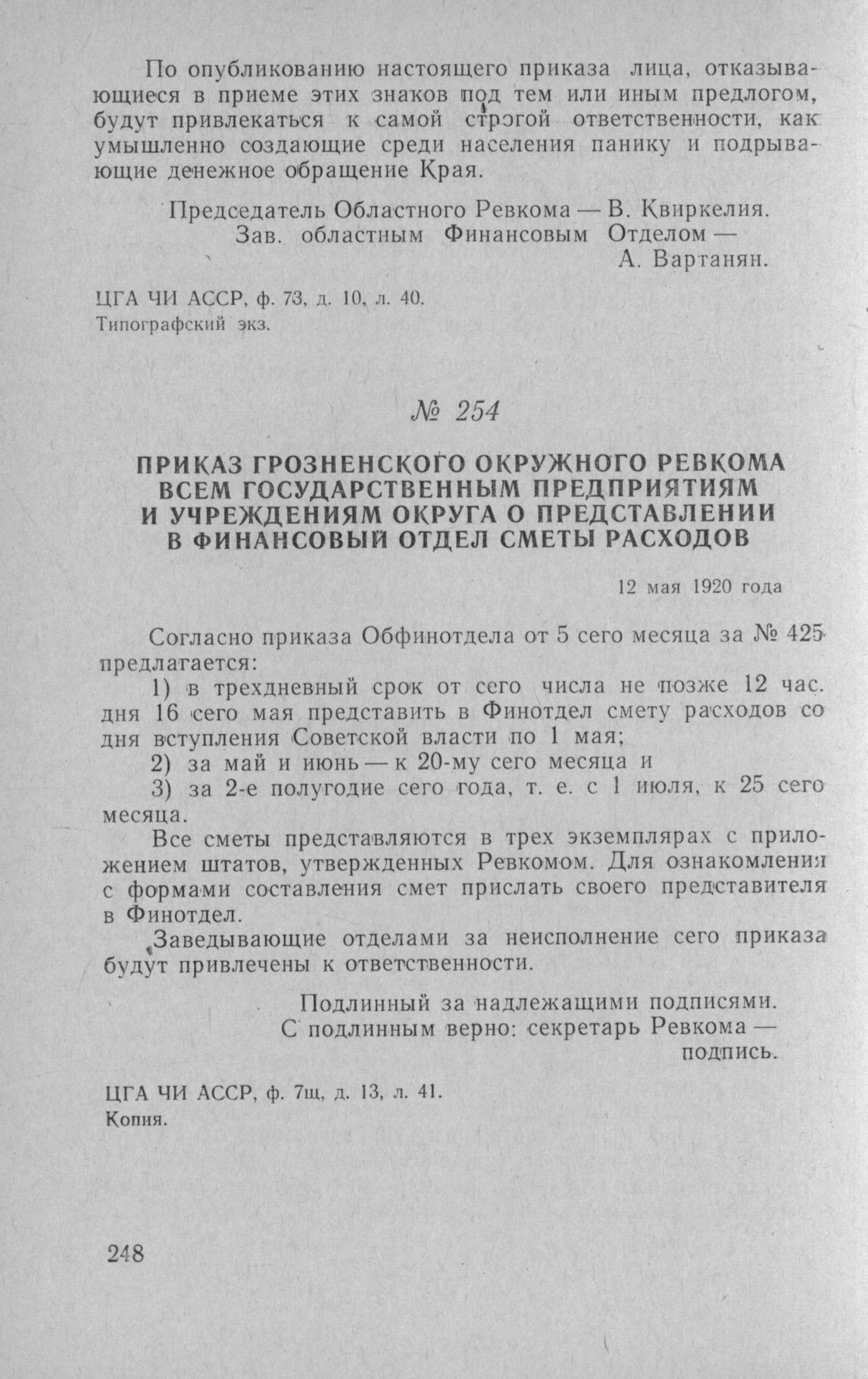 Приказ Грозненского окружного Ревкома всем государственным предприятиям и учреждениям округа о представлении в финансовый отдел сметы расходов. 12 мая 1920 года // ЦГА ЧИ АССР, ф. 7Щ, д. 13, л. 41. Копия.