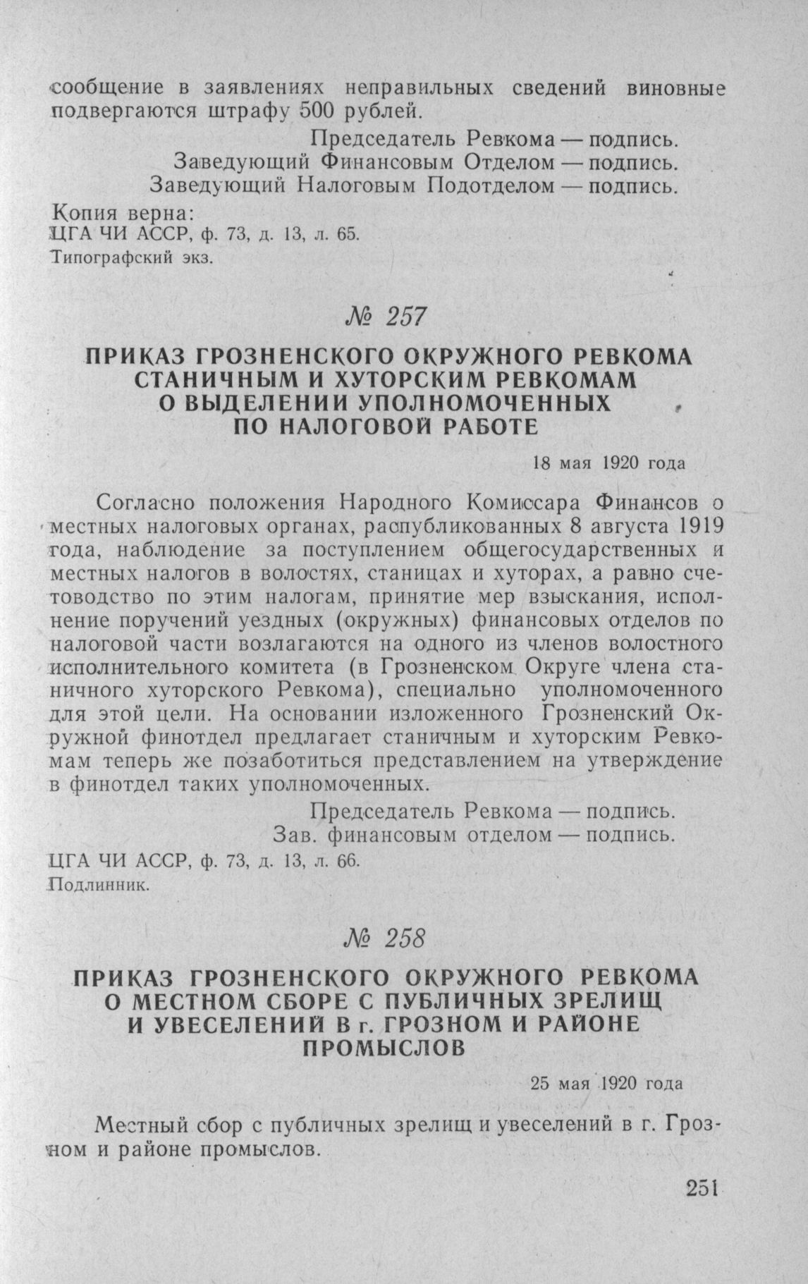 Приказ Грозненского окружного Ревкома о местном сборе с публичных зрелищ и увеселений в г. Грозном и районе промыслов. 25 мая 1920 года // ЦГА ЧИ АССР, ф. 73, оп. 1, д. 13, л. 171. Копия.