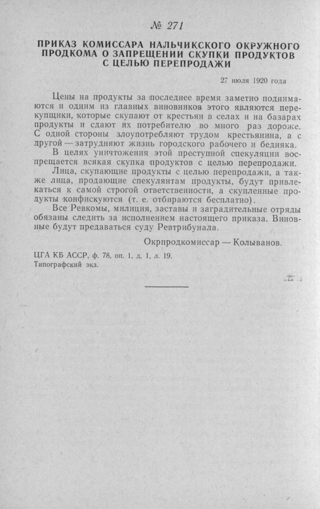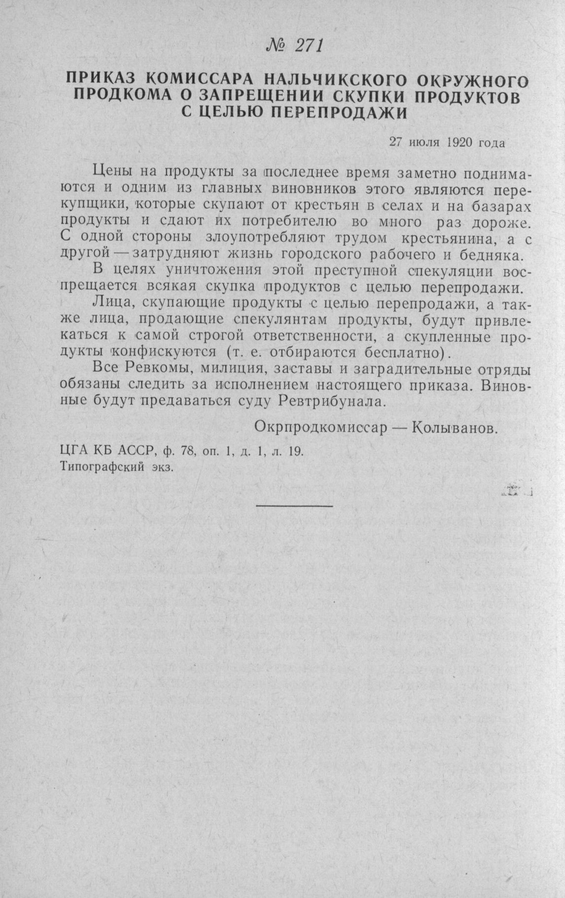 Приказ комиссара Нальчикского окружного продкома о запрещении скупки продуктов с целью перепродажи. 27 июля 1920 года // ЦГА КБ АССР, ф. 78, оп. 1, д. 1, л. 19. Типографский экз.