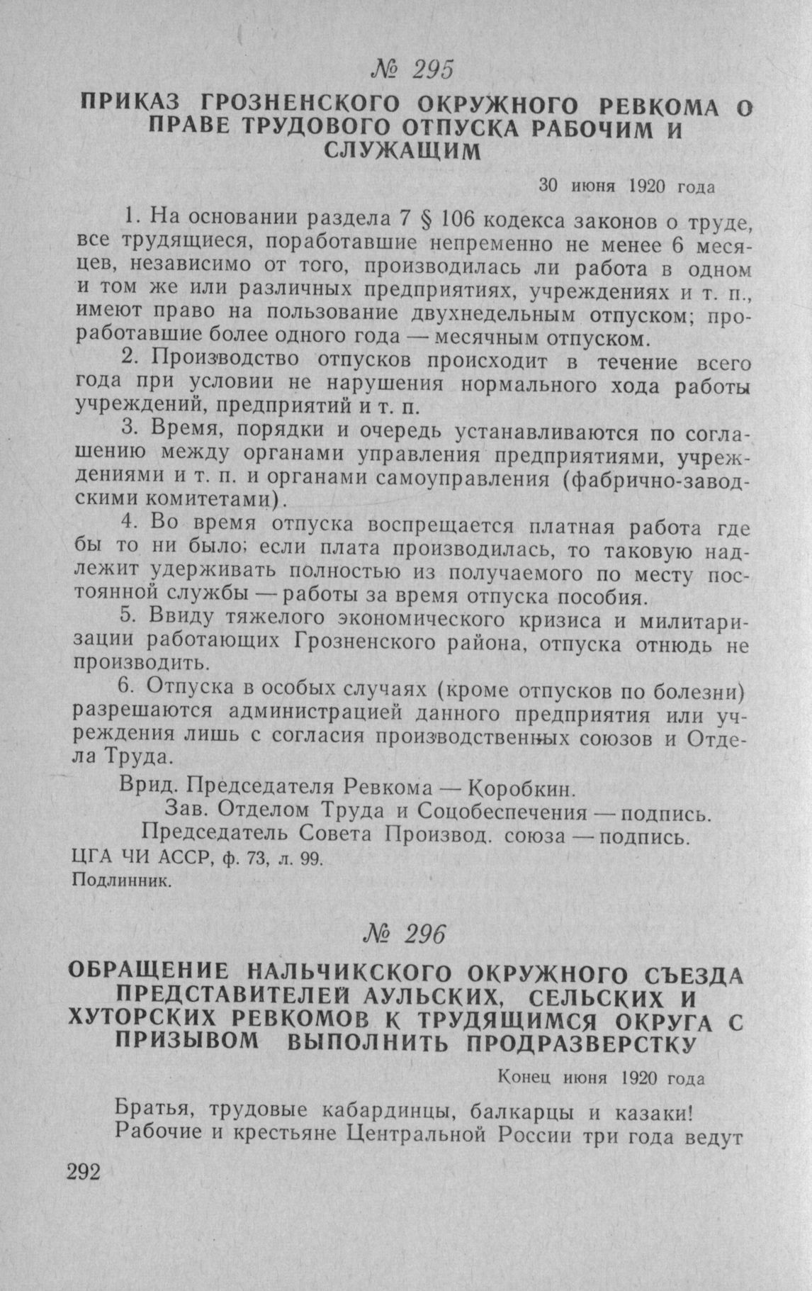 Приказ Грозненского окружного Ревкома о праве трудового отпуска рабочим и служащим. 30 июня 1920 года // ЦГА ЧИ АССР, ф. 73, л. 99. Подлинник.