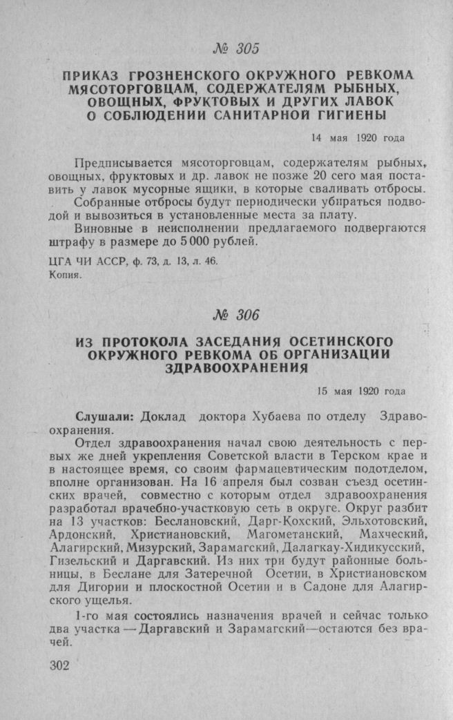 Приказ Грозненского окружного Ревкома мясоторговцам, содержателям рыбных, овощных, фруктовых и других лавок о соблюдении санитарной гигиены. 14 мая 1920 года // ЦГА ЧИ АССР, ф. 73, д. 13, л. 46. Копия.